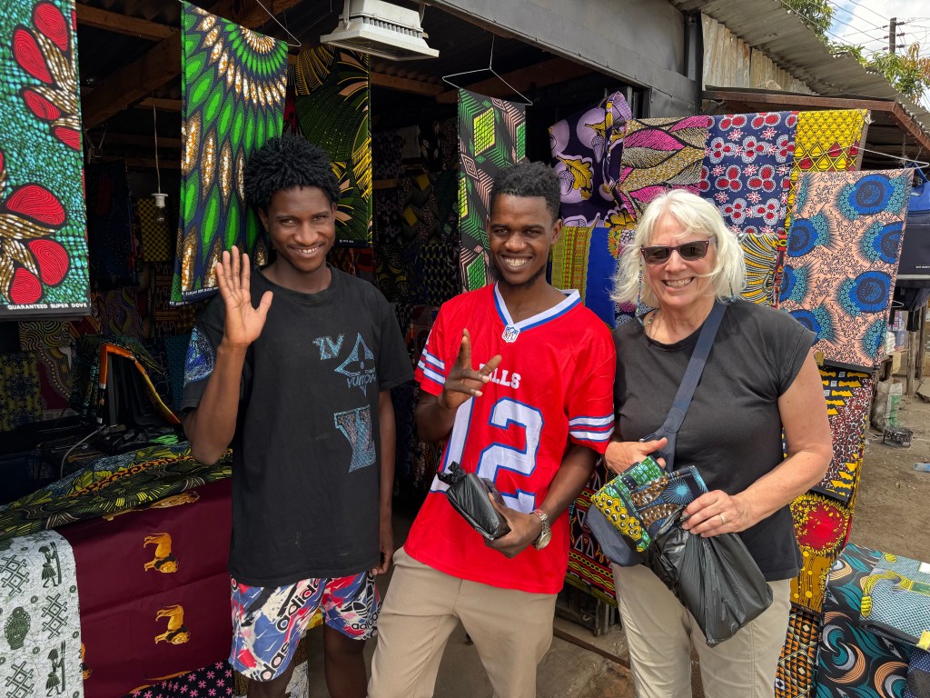 After breakfast we fly in the Cessnas back to Livingstone airport. We tour a bit of the city where most of the people live without running water or electricity. We had time to walk around their local market and I bought some fabric from these young men.