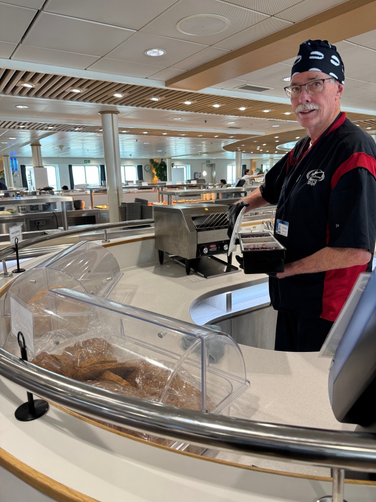 Learning new things is a wonderful thing! I think! After a a day to settle in and a morning class on food safety we are ready to get to work. The schedule is spread over two weeks. This is the easy week – Work Wednesday and Thursday, off Friday, Saturday, and Sunday. Nest week is working Monday, Tuesday. Off Wednesday and Thursday, then working Friday, Saturday, and Sunday. Even through Kathy is in the Galley, we both have the same schedule.