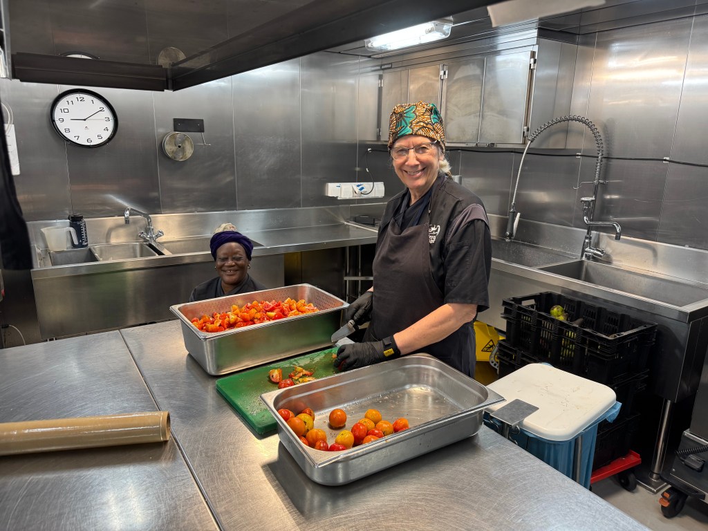 Galley (Kathy) – I have begun work in the galley in the cold room or salad room. I work with a delightful hardworking group of Africans. The oldest worker is Bernadette, but everyone calls her Grandma. Since I am older than she is, I just call her Bernadette! So far, my work includes a lot of chopping and cleaning. So much cleaning!! The twelve hour days are long but doable. There is so much to learn still and it is an education to see all the work that goes into providing breakfast, lunch and dinner to 600 people.