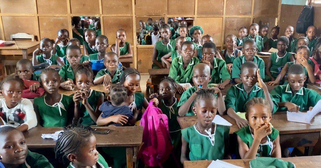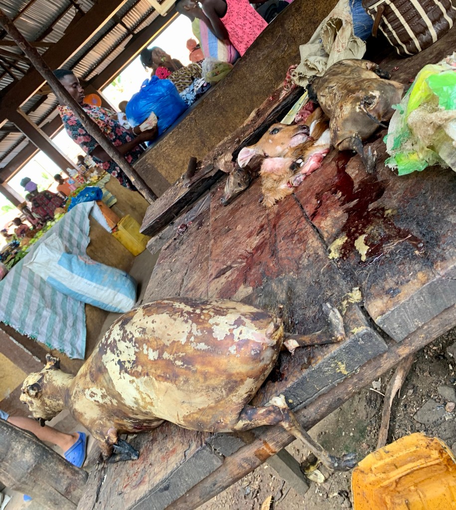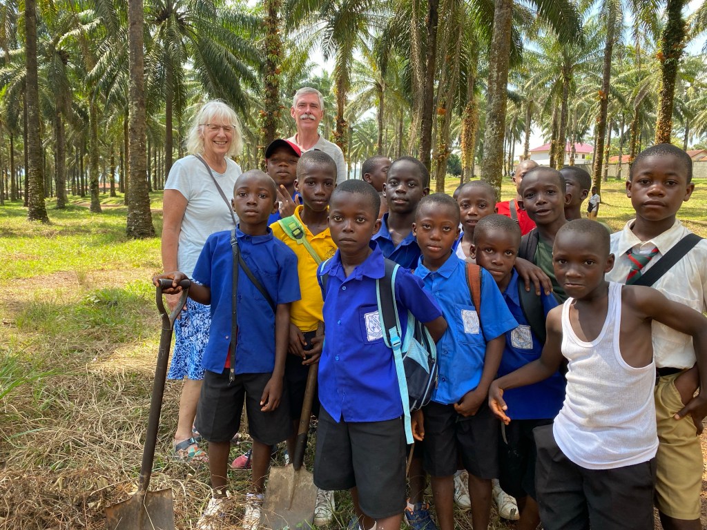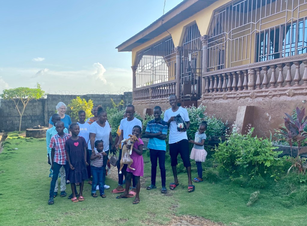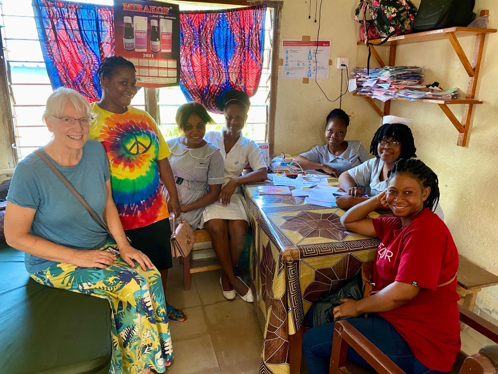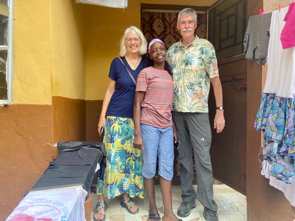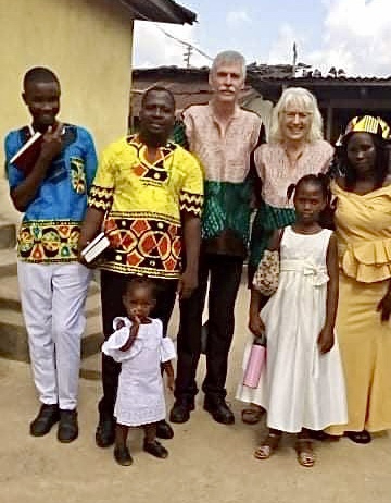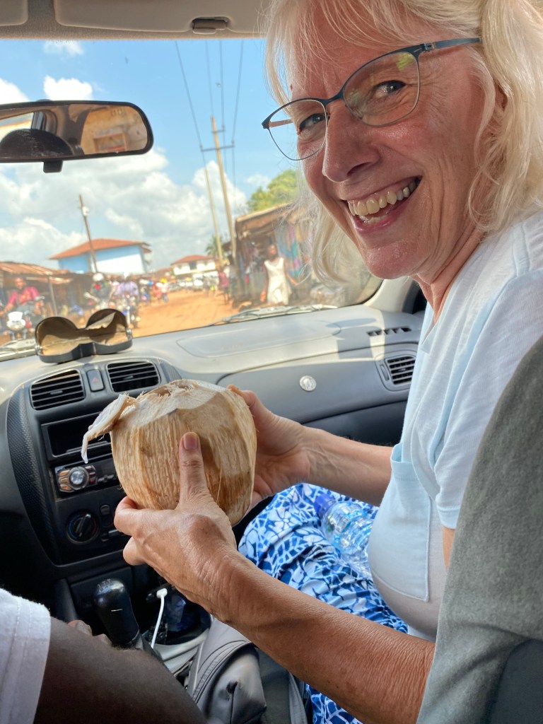 Christiana greeted us and invited us into her parlor. She stayed on the porch cooking. To our surprise Moses and Pastor Harris were there having arrived the past night from Liberia. We had a nice discussion with them about their vision for helping village children and at risk children in Monrovia. They presented us with the gift of African dress.
