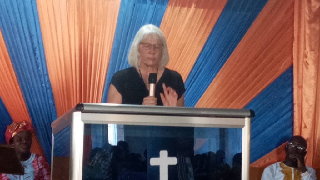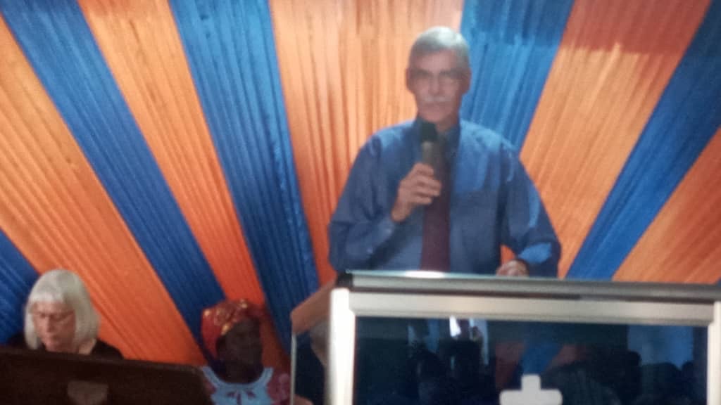 There were a few very lively worship songs with singing, clapping and a little dancing. There were a lot of comments in Krio that we didn’t follow well. The choir sang a beautiful song and the we were introduced. I gave our greetings and then Tim preached on Psalm 100. (Tim’s addition: Kathy was also part of the preaching and was excellent. It was such a blessing to present this passage with her.)