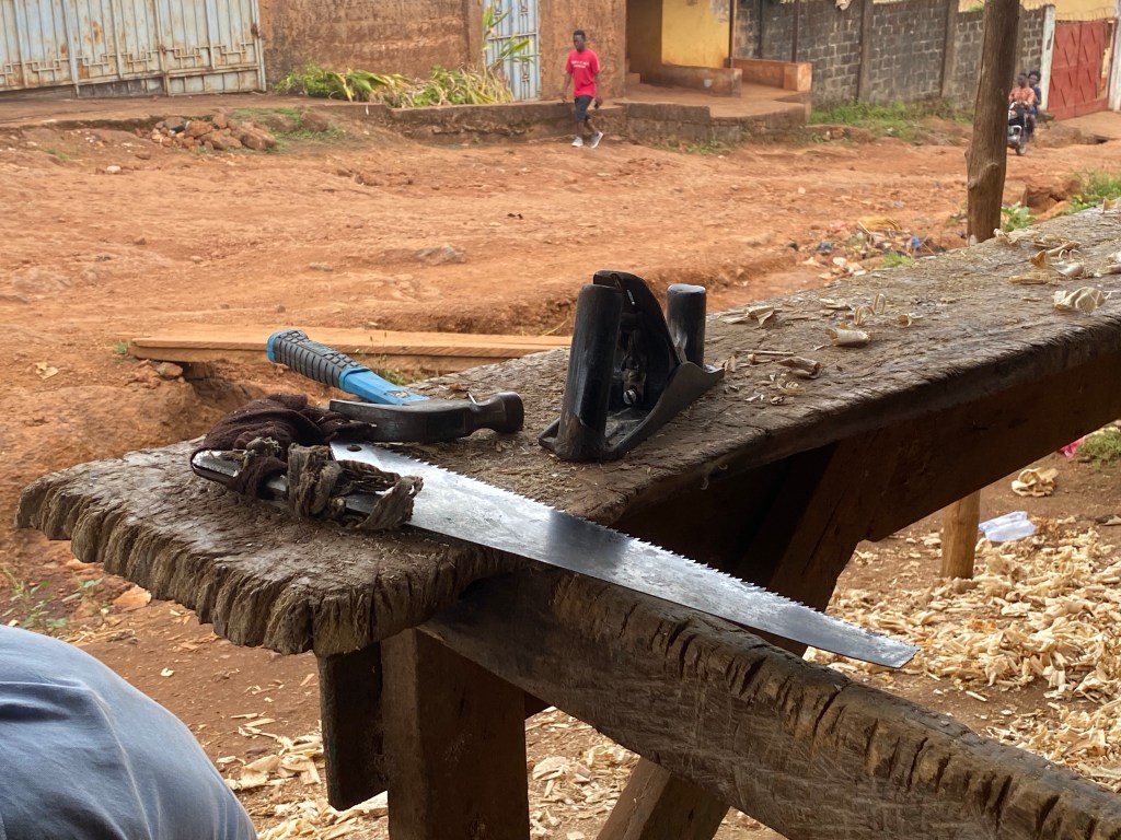 OSHA in the United States would be very overwhelmed! No safety guards, spraying paint with no controls, no breathing protection. The wood shop that Brian and I share is so much easier and safer to use. We are so spoiled! The art of hand craftsmanship thrives in Sierra Leone!