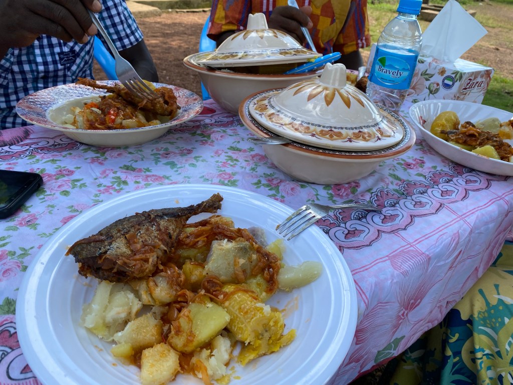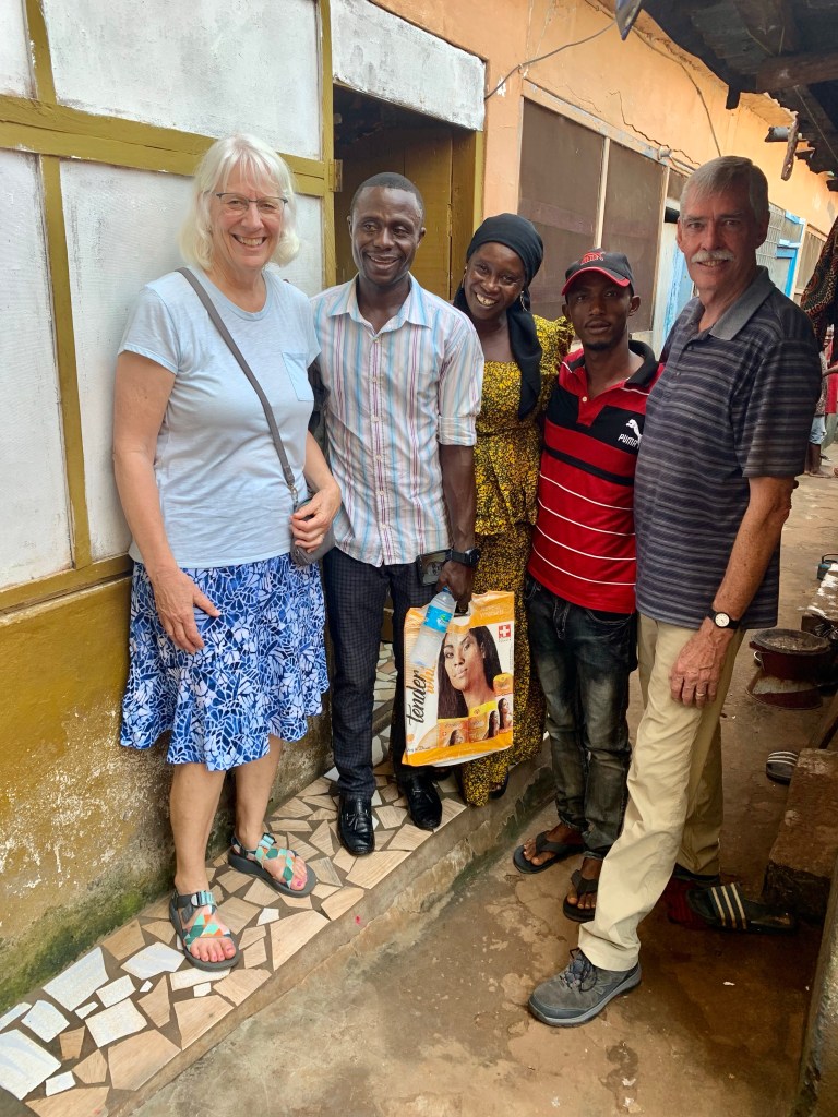 Augustine invited us to visit his place this morning. It is very small but welcoming. His mother, Hawa, prepared the food. It was fried fish, tomato’s, cucumbers and plantains. It was delightful to share the meal in his place with a few of his family. Hawa asked if Tim could pray for their family. It was very special.