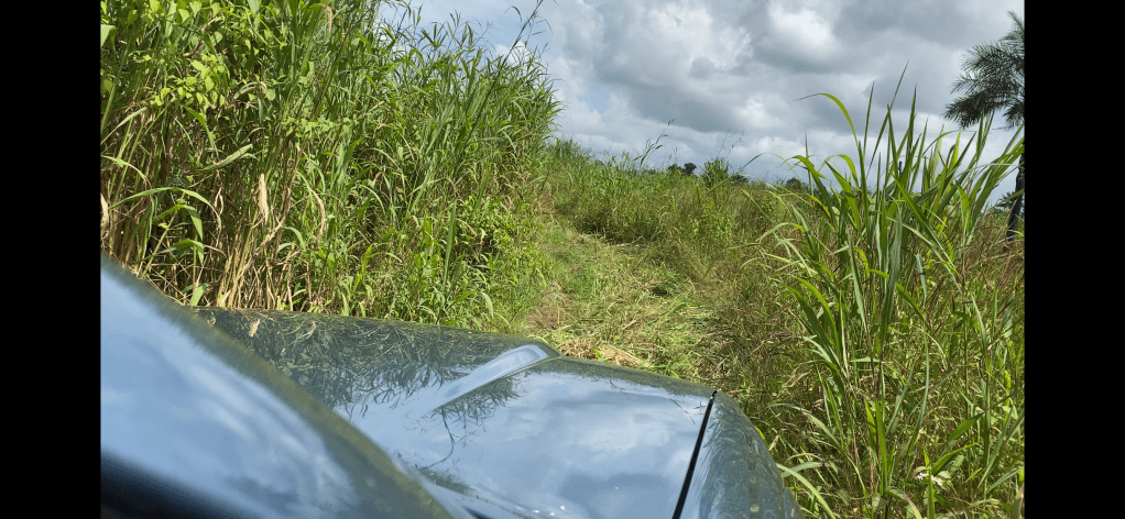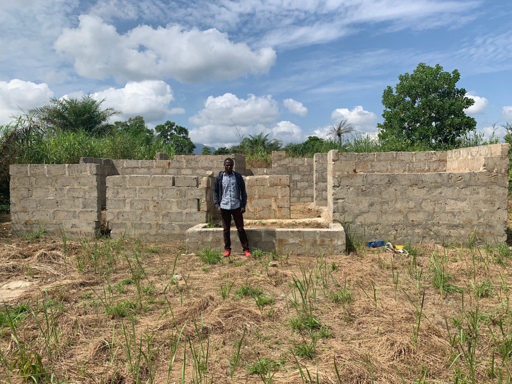 Today we are on our way to Kambia, a small town north on the Guinea border. At the town of Waterloo, we make a detour to see Augustine’s property. It is situated down another very bumpy road. Sometimes it seems like we are driving through the brush, as the vegetation is high following the rainy season. His plot is a nice size and he has begun building walls of concrete blocks which are all made from scratch.