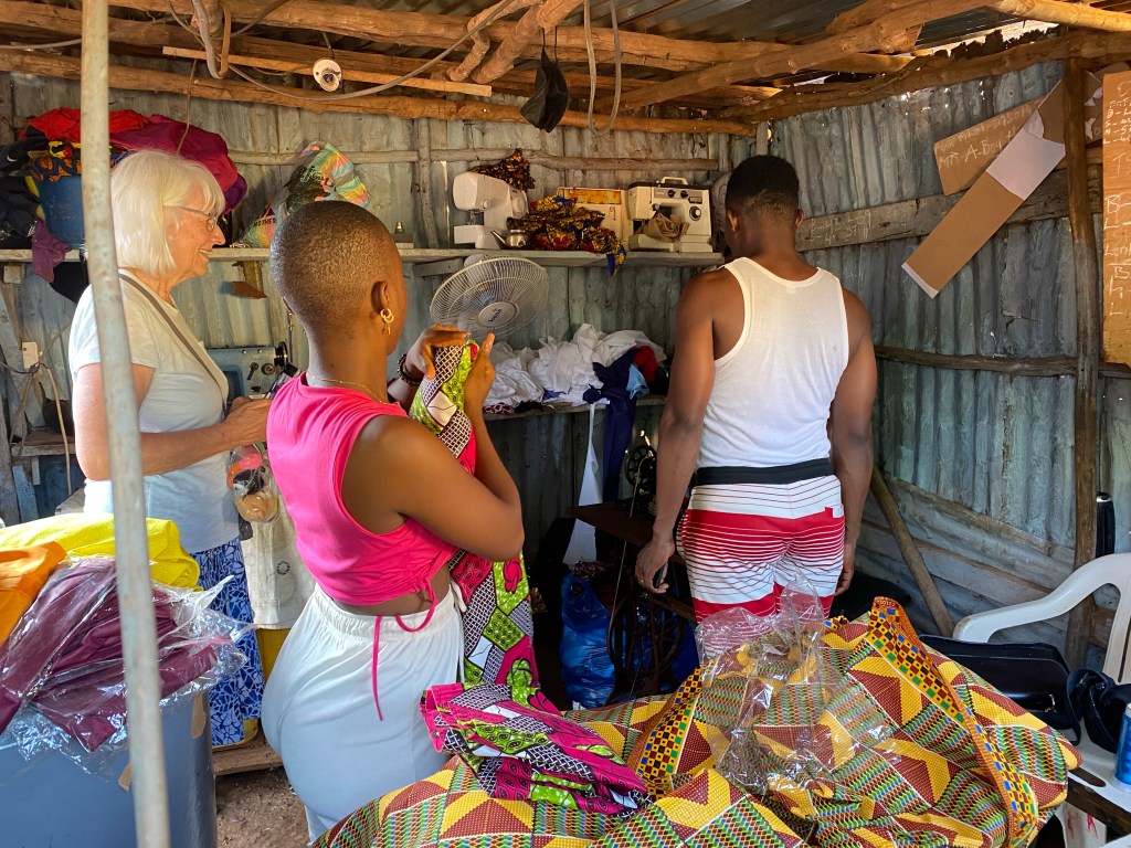 We took a walk around the neighborhood and visited the local tailor. We also visited the community clinic and saw some nice gardens full of vegetables.