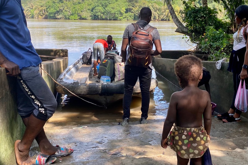 We are met at 8:00 am by our tour guide from VSL (Visit Sierra Leone). We are headed off on our birding tour to Tiwai Island. It is a long drive and taking a lunch break in Bo. We head south from Bo and eventually turn off on a dirt road that was bumpy at times. There are little villages along the way. In one village the children are waving and yelling, “White man, white man!”
