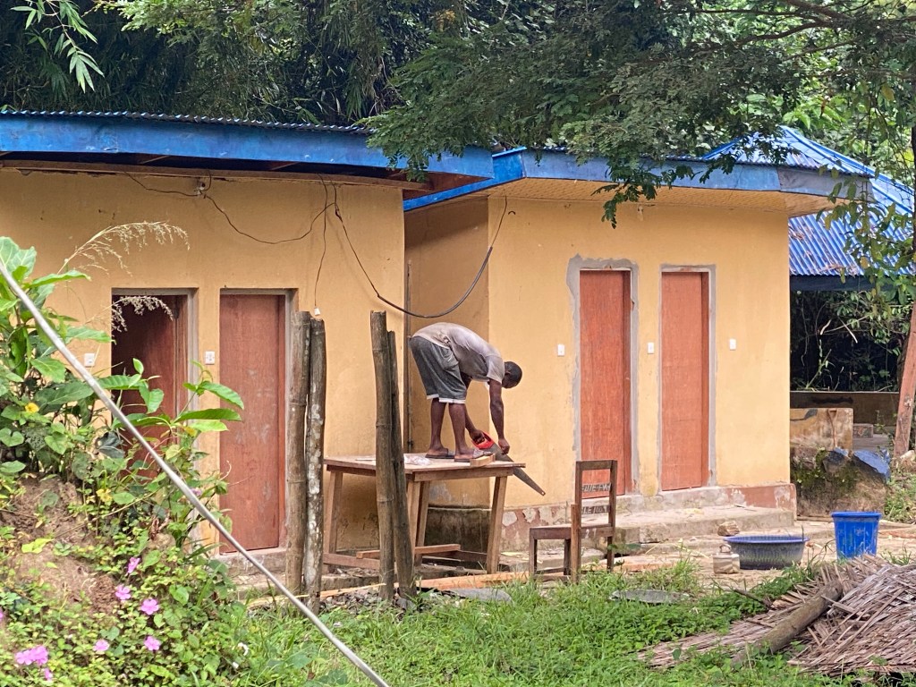 They take us to the guesthouse to rest. It is difficult as it is 90 degrees and humid. This is a typical African accommodation. No electricity until 7 pm, no running water, but plenty of water in buckets to do what we need. We should have brought our insect repellent, our bamboo sheets and our quick dry towels for such a situation. But, no, we left them back in Freetown. We just weren’t thinking or didn’t know what we were getting into. (We are faithfully taking our Malaria pills!) We are doing something right.