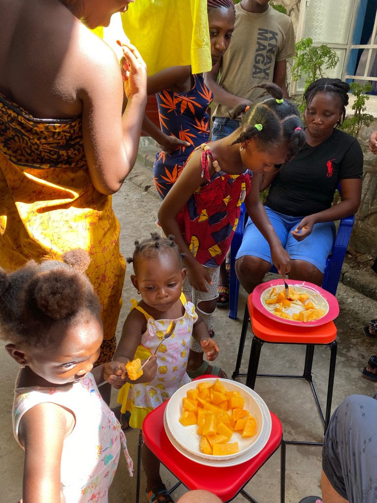 Mariama served us some rice with green curry sauce. We were also treated with some fruit including my favorite, papaya.