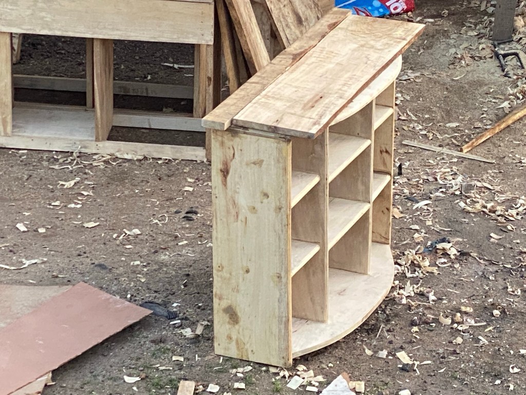 I’ve looked in at several woodworking shops and most of the furniture is made using hand tools. A lot of the wood seems to be a variety of teak. There is some plywood material used. Much, if not all of the hardware I have seen is reclaimed or hand made. It seems nails are often used rather than screws. The end result is rustic and creative.