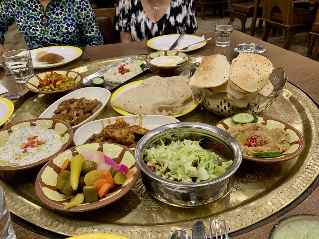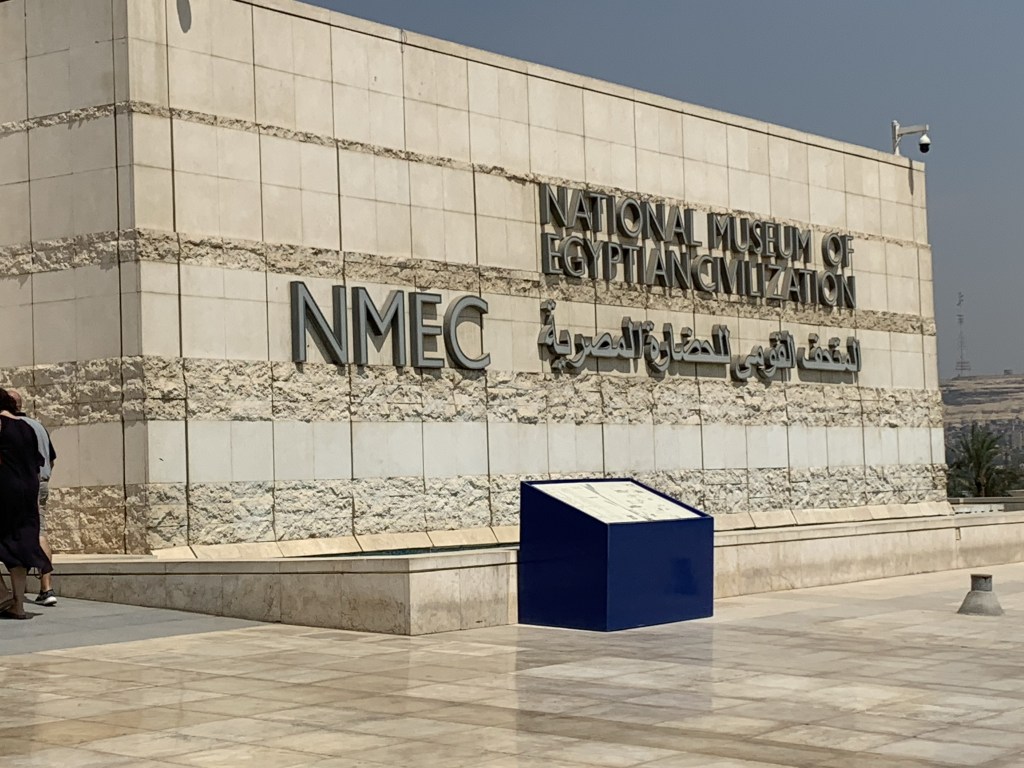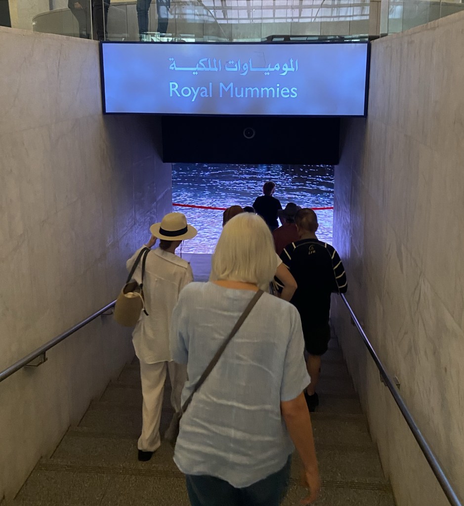 This is the last day of our trip. We take the short flight from Aswan to Cairo. We then head to the National Museum of Egyptian Civilization. In 2021 the 22 royal mummies were moved in a large parade from the Egyptian Museum to this newer museum. There are 18 kings and four queens. We were not able to photograph them, but it was amazing to see these great pharaohs and their coffins. Imagine seeing the mummy of Ramses II and his queen, Nefertari!