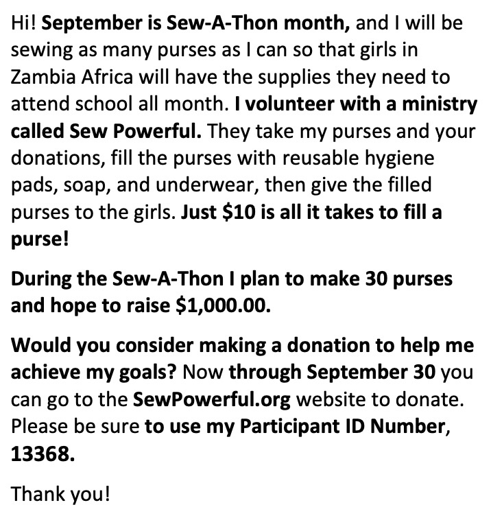 I traveled to Zambia in 2016 to learn about a project that I had sewn purses for. The project was located in a slum area of Lusaka called Njombe. I have been volunteering with them the last eight years. This month I am participating in a fundraiser. The information is below and I would love your support!