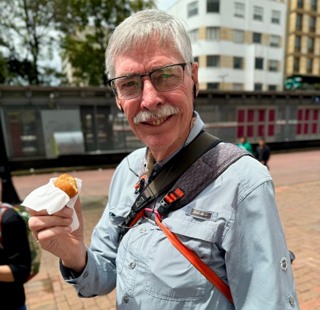 We decided to skip the hotel breakfast and find a place nearby. However it was Sunday and most everything was closed! We found a small place on the corner and got traditional breakfasts of coffee or chocolate, cheese and almojábana, a round small roll made from corn flour with fresh cheese in the middle. I had the hot chocolate and broke up my cheese and put it into the chocolate, which is the preferred Colombian way.