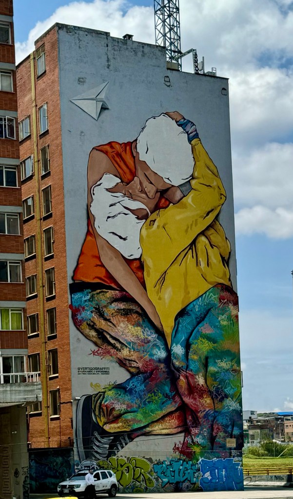 We followed the market experience with a tour of the graffiti and street art in Bogotá. We were led by a local artist, Monica, who gave us a history of the art. She began with the first wall mural that was commissioned. It was a wall near a homeless encampment entitled “The Kiss of the Unseen Ones”.